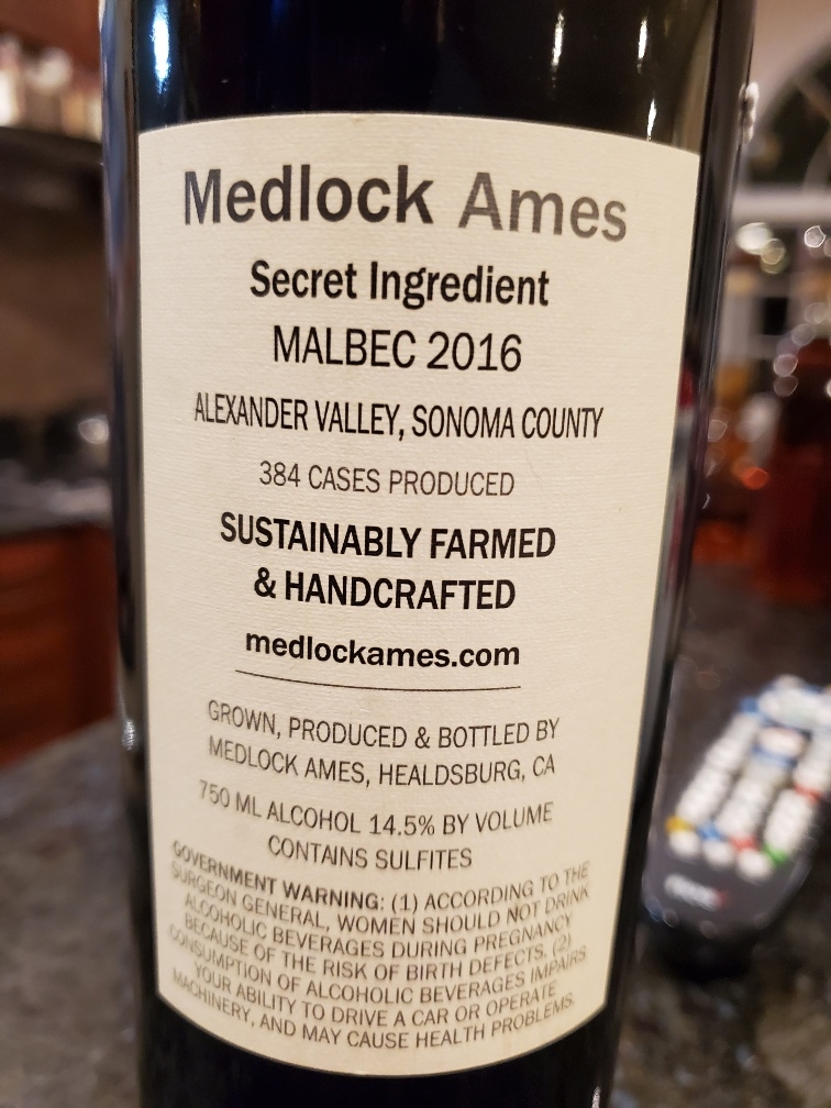 Kathleen brought a nice wine too! Medlock Ames Secret Ingredient 2017 ,A Malbec