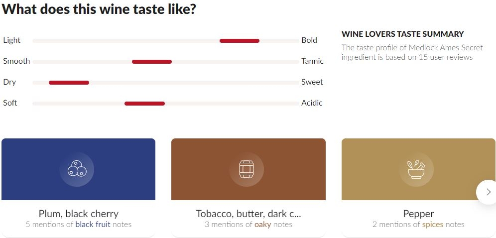 Kathleen's Medlock Ames Malbec has a very light tannin structure. Its very smooth and just a little on the drier side but very enjoyable. Definite dark fruits like Plum Black Cherry and Black raspberry. Really a beautiful dark purple/magenta color that has a nice finish! 4 1/2 glasses